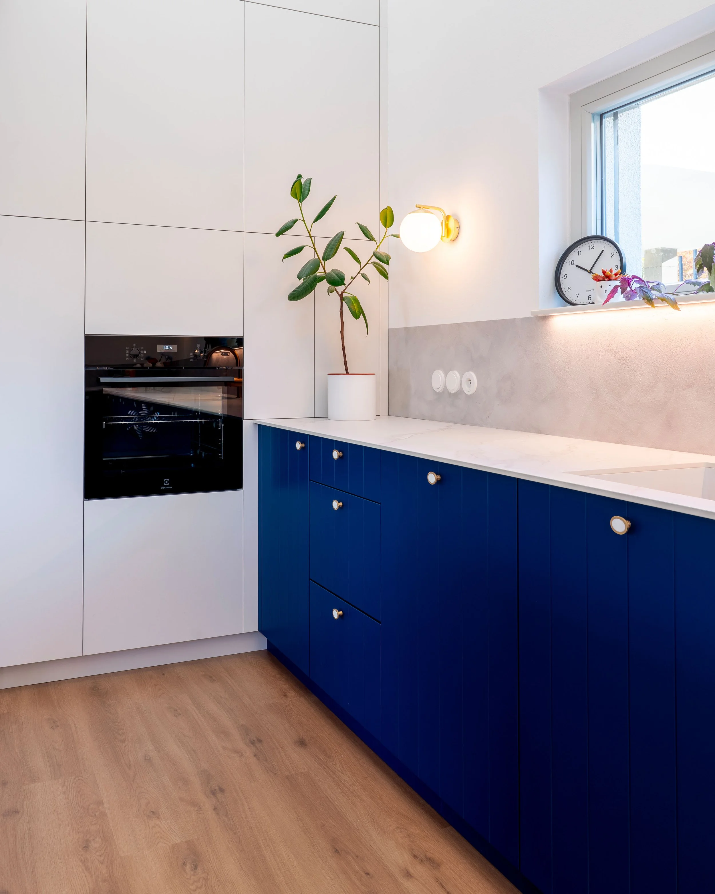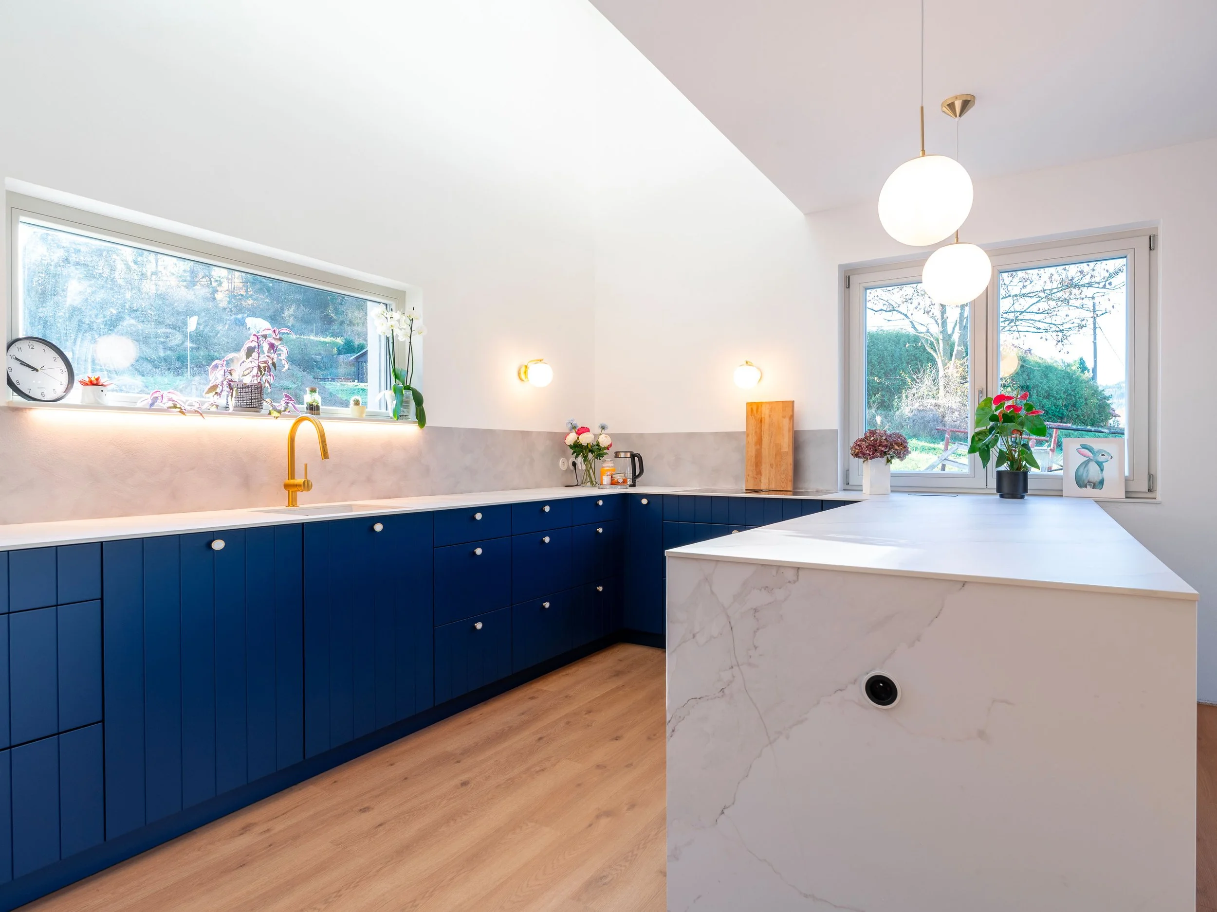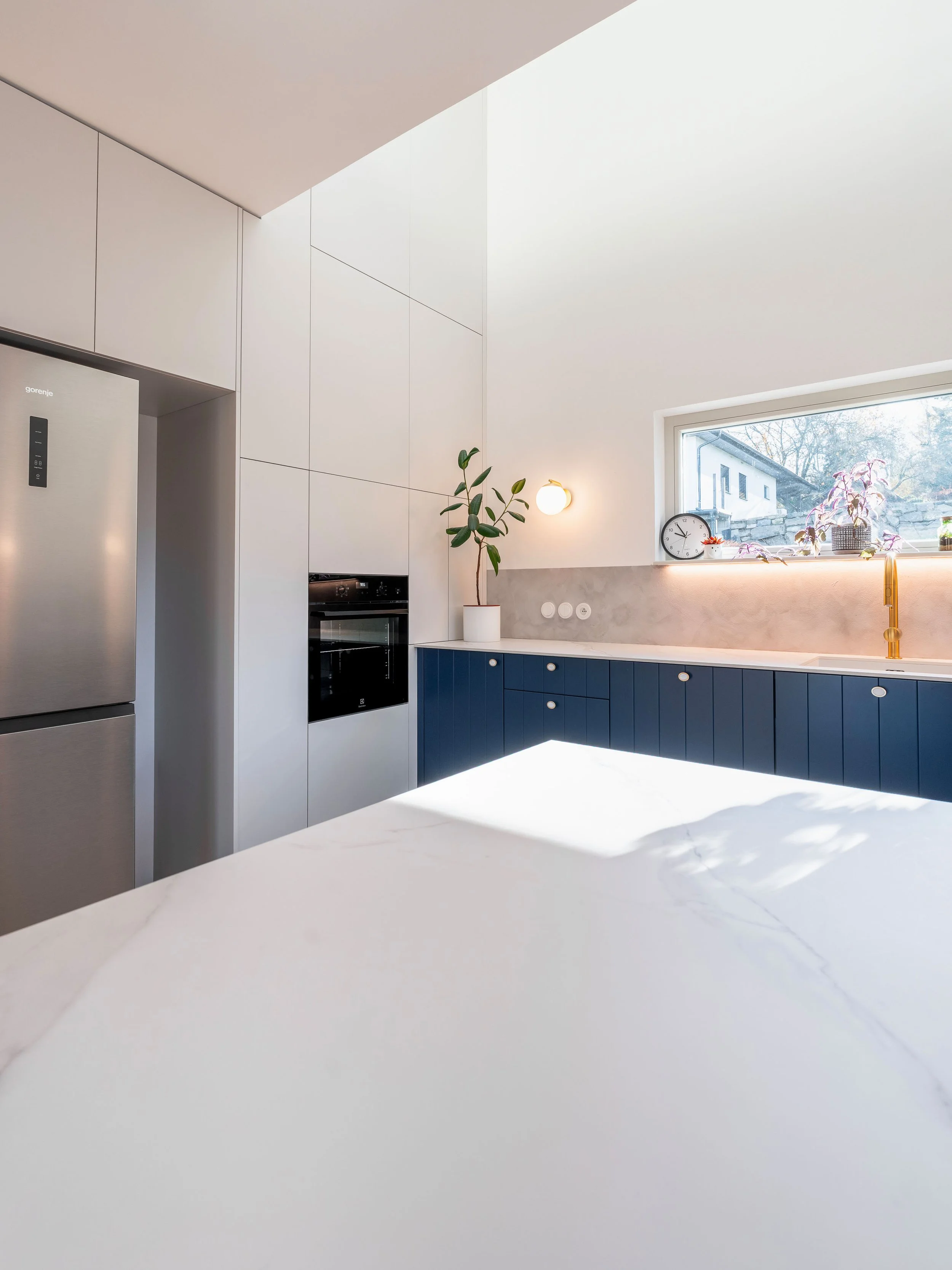 Koncept této kuchyně stojí na jednom principu: nechat prostor dýchat výškou. Drážkované plochy vedou pohled směrem nahoru, vytvářejí rytmus a vizuálně propojují dvě patra. Barevná kombinace modré a šedé s jemnými zlatými akcenty dodává prostoru eleganci bez přílišné okázalosti.
