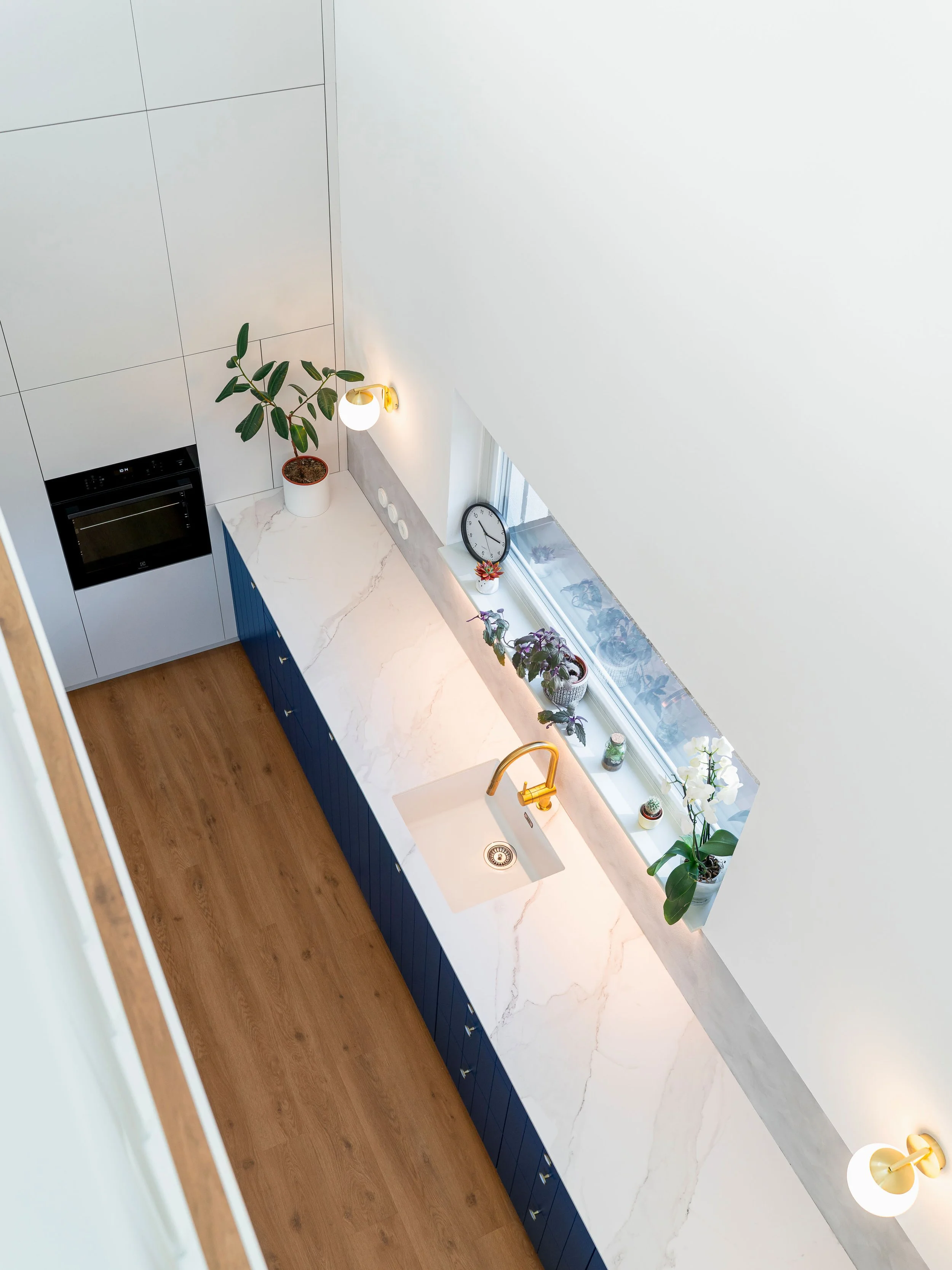 Opačný pohled z patra překvapí čistotou a minimalismem — shora je kuchyně převážně bílá a klidná, s modrými a zlatými akcenty, harmonicky propojená s horními úložnými prostory. Dva pohledy, dva světy, jeden promyšlený celek.