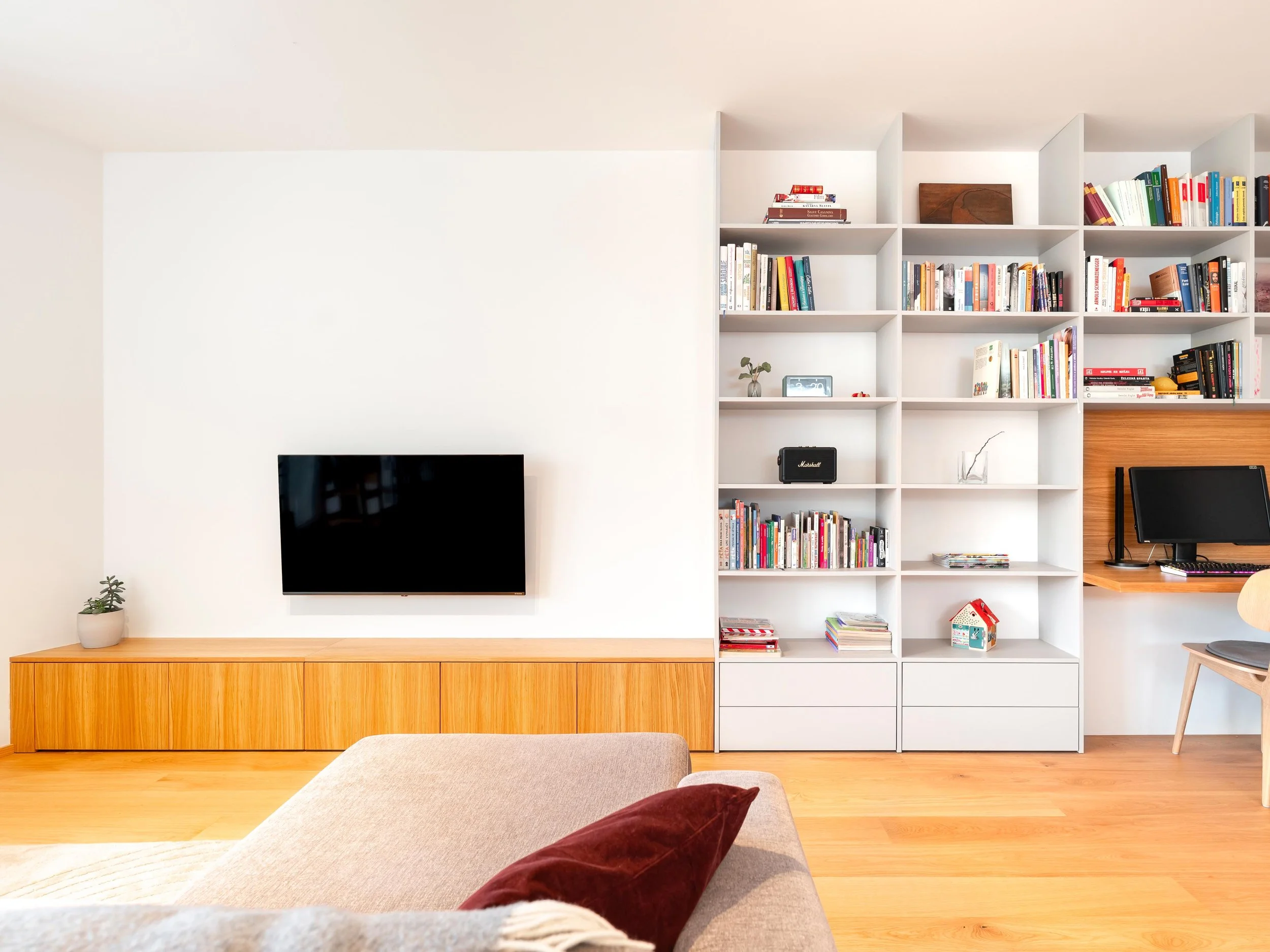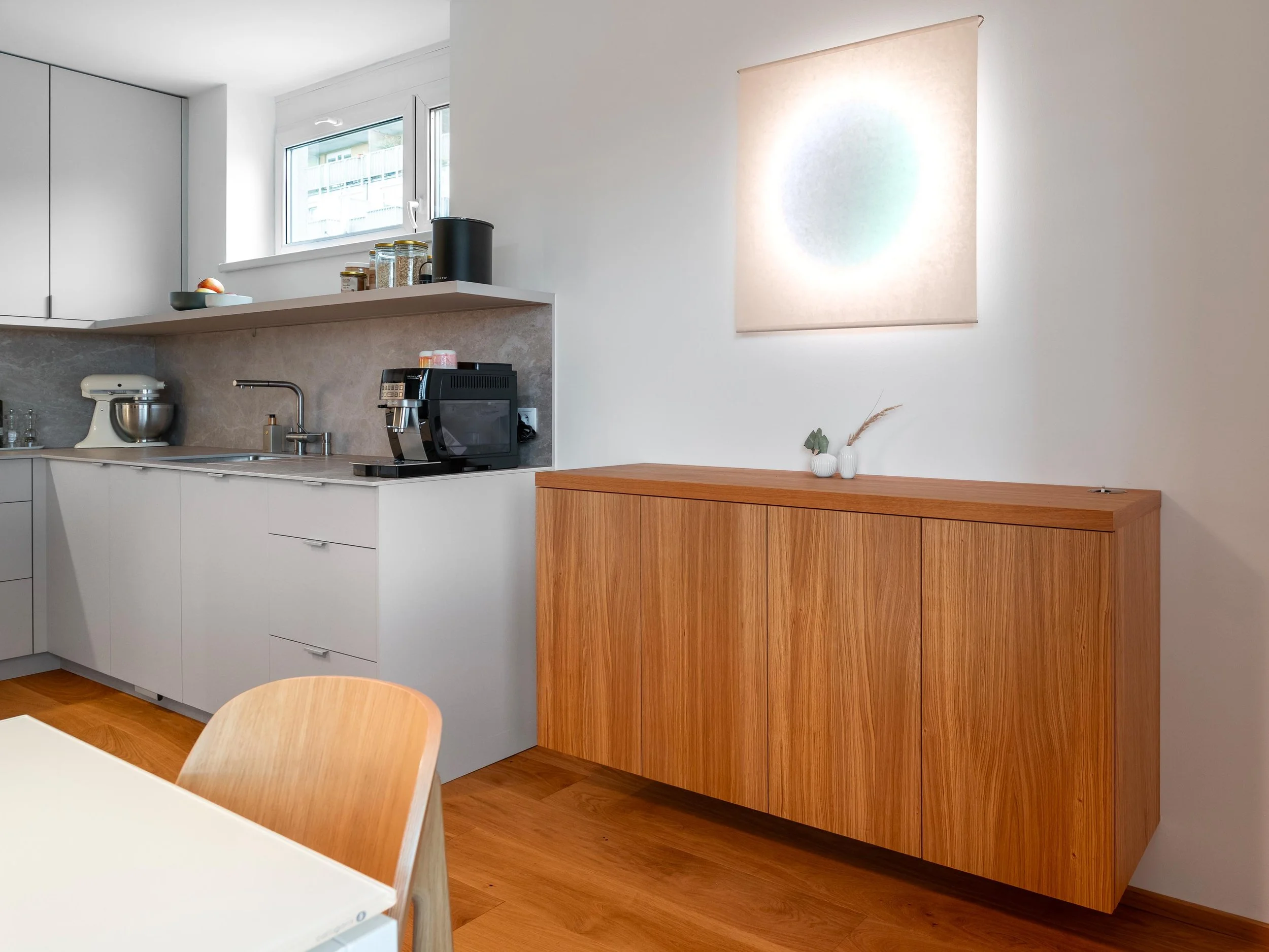 Moderní elegance s důrazem na detail. V tomto prostorném bytě na pražské Homolce jsme realizovali kompletní truhlářskou výrobu podle architektonického návrhu dodaného klientem. Náš úkol? Vyrobit a namontovat veškerý nábytek s precizností, která dělá rozdíl – od kuchyňské linky v kombinaci kašmírově šedé a teplé dubové dýhy až po vestavěné šatní skříně a promyšlený nábytek do dětského pokoje.