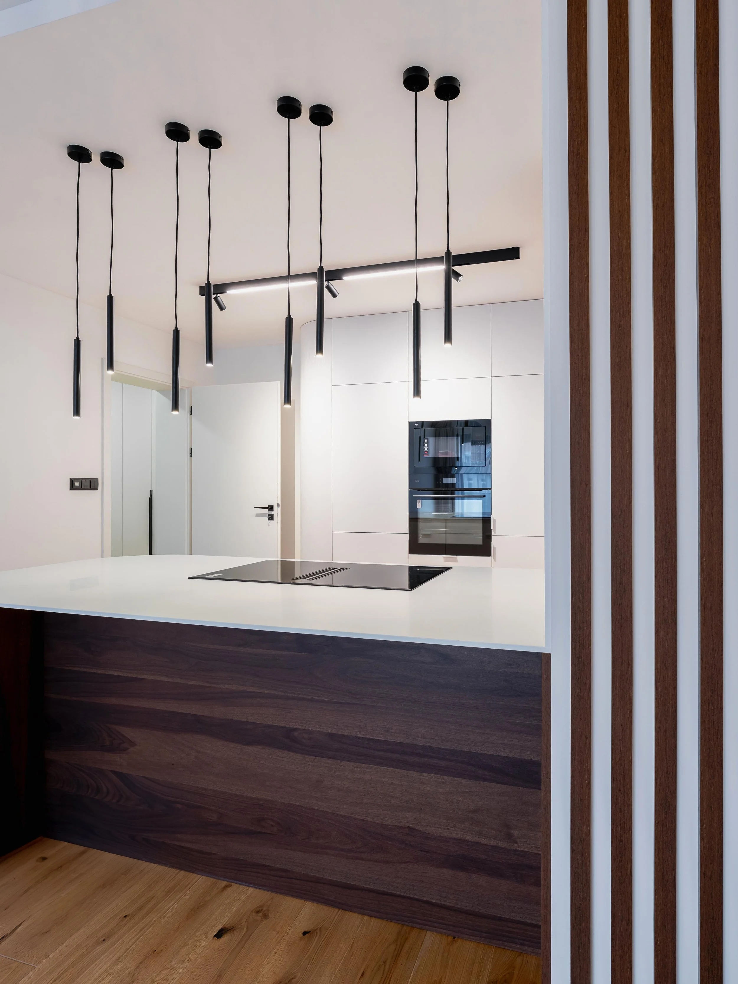 Nadstandardní materiály. Precizní řemeslné zpracování. Prostor, který dýchá klidem. Tento interiér rodinného bytu jsme postavili na kombinaci umělého kamene, dýh Shinnoki a laminovaných desek, které společně vytvářejí nadčasový a elegantní celek. Nábytek na míru nabízí velké množství úložných ploch pro celou rodinu, přesto prostor působí opticky vzdušně a světle.